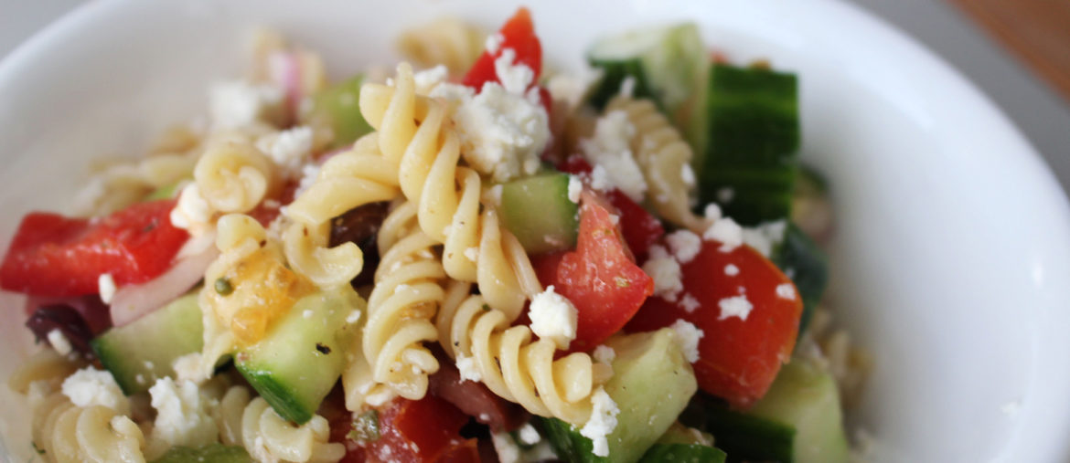 Pour preparer la vinaigrette, au melangeur, a haute vitesse, reduire en un melange cremeux l huile, le jus de citron, l origan et l ail. Dans un grand saladier, melanger les pates avec le fromage Feta canadien, les tomates, le concombre, les olives, le poivron vert, le persil et les oignons verts. Arroser de vinaigrette; bien remuer. Saler et poivrer au gout.